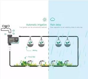 Skru den blot direkte på din vandhane, og så er du færdig. Du kan tilslutte en slange eller et system af rør og sprinklere til udløbet. Programmering sker med en enkelt knap. Brug drejeknappen, og følg rækkefølgen for hver zone: indstil tidspunktet > indstil starttidspunktet > indstil vandingsvarigheden > indstil vandingsfrekvensen > tænd den, og så er du færdig. Dit automatiske vandingssystem er nu programmeret.